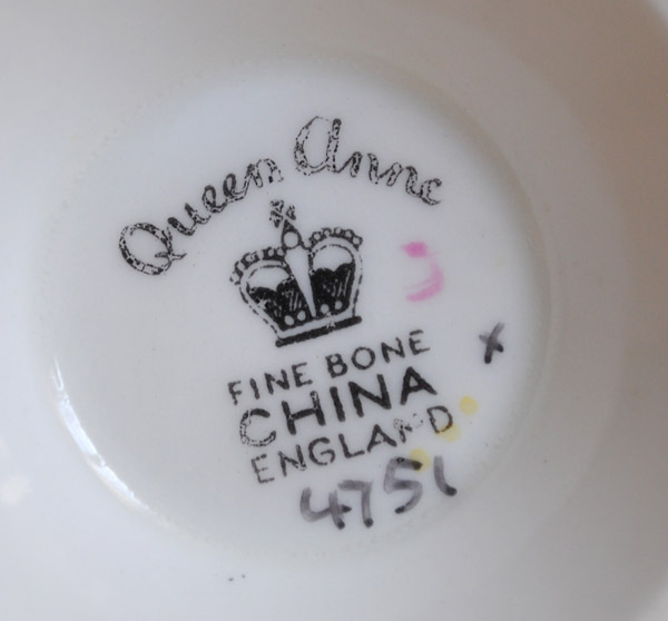 As you can see by the backstamp, it was made in England by Aynsley, this company often created the corset shaped cup. The hand written number (?) in black could signify the artist of the cup. John Anysley started his company in 1788 because he loved to collect china. His son tried to follow in his father's work, but was not able to run the company well. Mr. Aynsley's grandson began to work at the company at age 9, sometimes working 16 hour days to learn the business. He did much better than his older brother, and the company did very well.