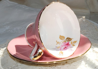 Terri, hi! Your teacup is lovely, lovely...The pink is very pretty, and of course the gold leaf and rose add just the right touch, not to mention the elegant shape. That really is a cool system for figuring out the date of the cup.