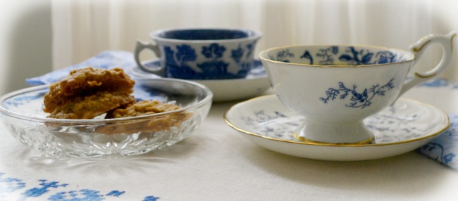 I have set up our table with two blue tea cups,