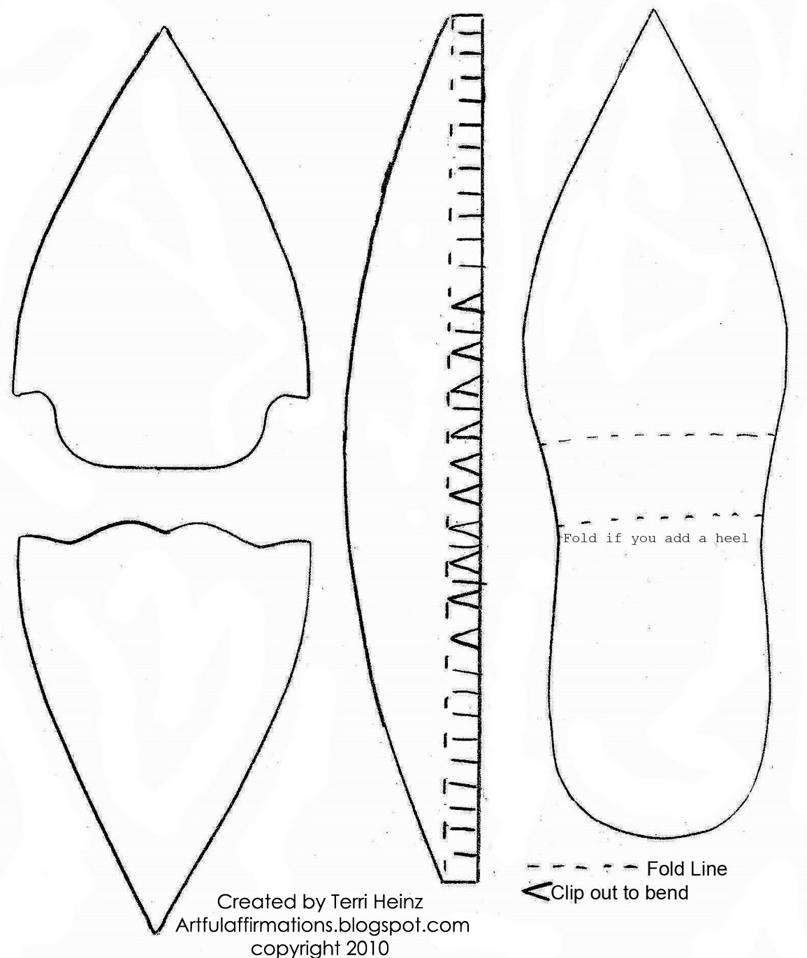(The proper size for the shoe is about 8'' from the tip of the shoe to heel, if your printer does not print it off near this size you can try "Print to fit" or try enlarging or reducing to get it near 8'')